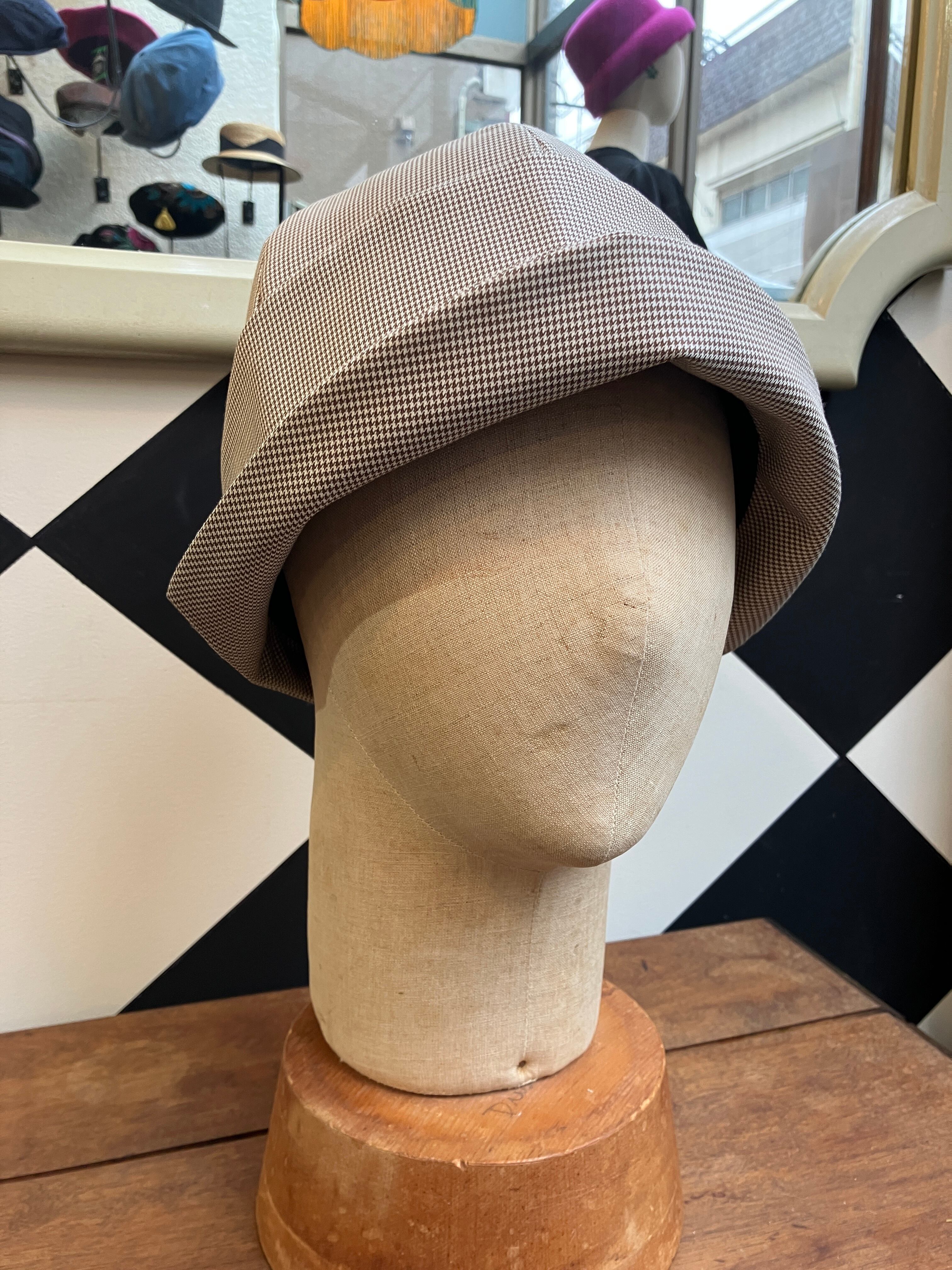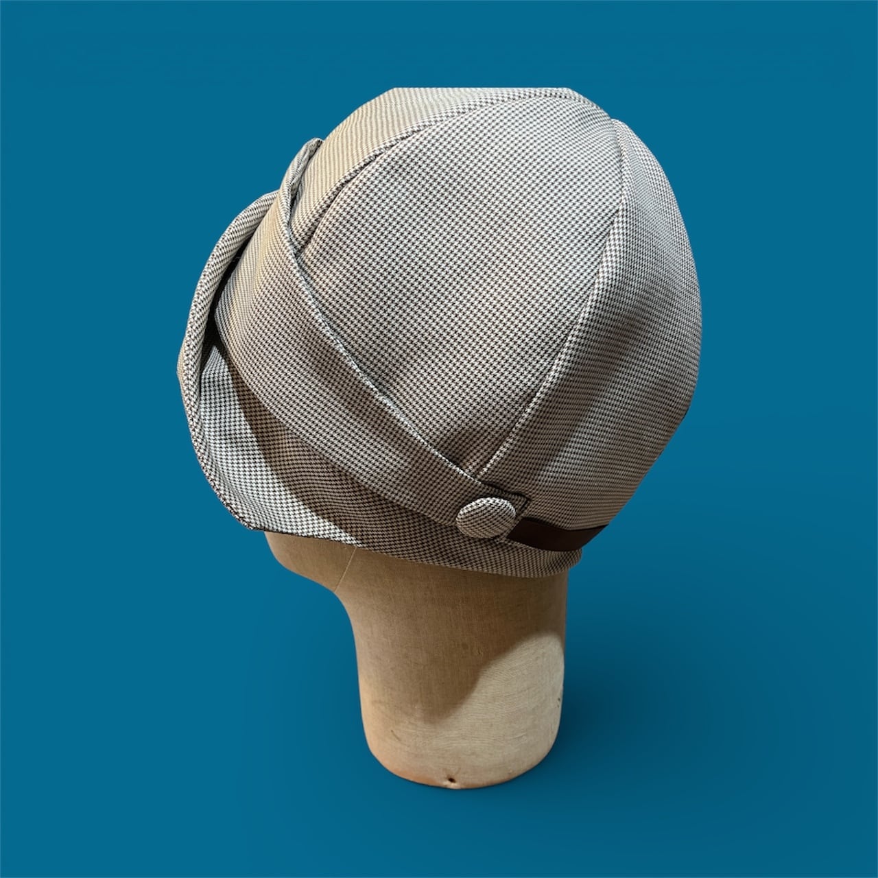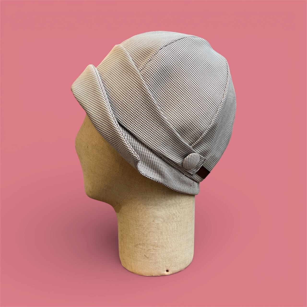 シルク100%のとても風合いの良い布で作ったクロシェです。両サイドが少しだけ下がっていて大正ロマン時代のモダンガールが被っていたような深い帽子です。鍔のめくり上げ具合によって色々な雰囲気になります。共布で作ったくるみボタンとグログランリボンがバックシャン。畳める帽子で、日除けもできるので旅行などにピッタリです。ヘッドサイズは56cmから58cmくらいまで。内リボンにマジックテープ式のアジャスターがついているので調整が可能です。
